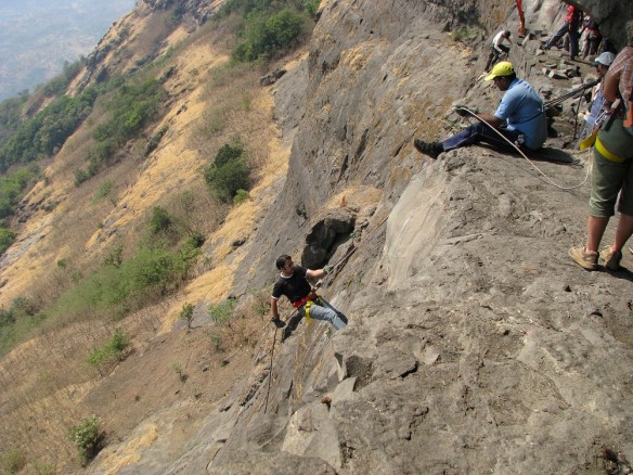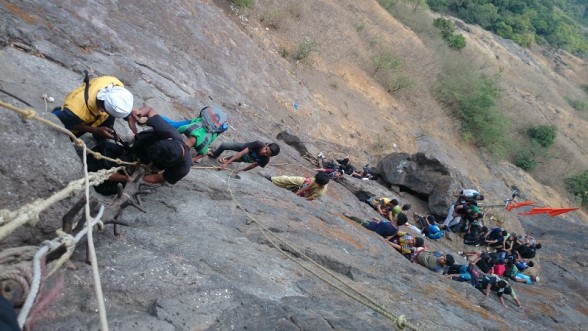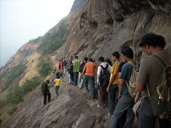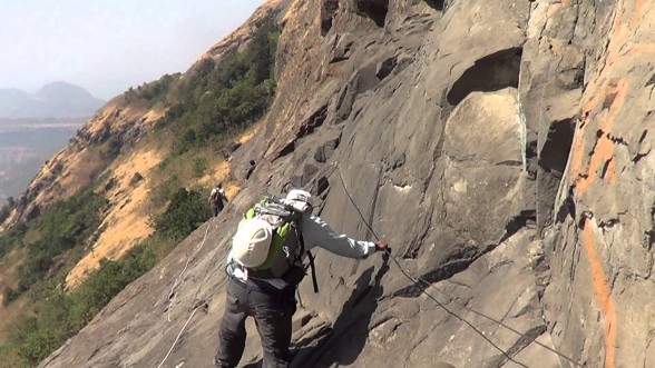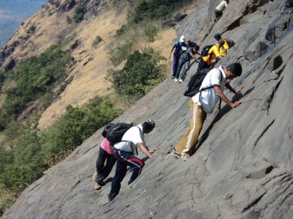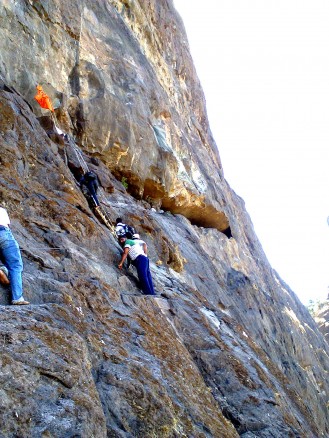 Dhak is one of the most exciting and challenging treks. Dhak Bahiri is located in the middle of a cliff of Dhak fort. There are three access routes to the fort. One is Jambhiwali, second is Rajmachi and the third is Sandshi. Our trek route begins from Jambhivali village. From Jambhivali we have to ascent through fairly dense jungle up to a steep gully. From here the real challenge begins. It is a rock patch of around 70 degrees gradient. After the rock patch we have to climb using the support of a wooden log which sways preciously .After and only after you climb the log can you reach the safety of the cave. There is a water hole in the cave. The water is ice cold in every season and used for cooking purpose.The cave is an impromptu temple of Lord Bahiri where sacrifices are carried out on regular basis.