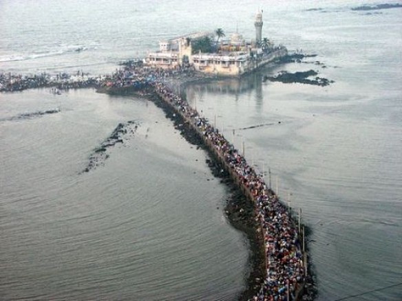 This mosque is located at the end of a long causeway protruding into the sea. It is the tomb of Saint Haji Ali, a wealthy Muslim who renounced the world and proceeded to Mecca. It is said that he died in Mecca and the casket miraculously drifted to the spot where the mosque was later built in his honour.