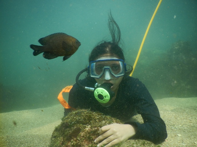 The diver enjoys her Kodak moments underwater.